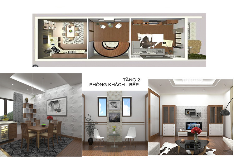 Không gian bên trong nhà đáp ứng đầy đủ không gian sinh hoạt của một gia đình Việt Nam, bao gồm phòng khách, phòng ngủ, nhà vệ sinh, nhà bếp, phòng sinh hoạt gia đình và phòng làm việc. Tất cả được phân chia hợp lý để phù hợp với diện tích vừa phải. Phòng khách được bố trí vị trí trung tâm có không gian lớn.